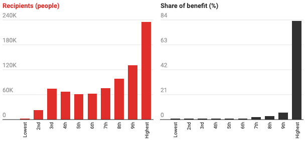 Similarly, older people benefit far more than younger people. People over 60 received 52% of the benefit, while those between 18 and 34 received 4%. That is despite both groups comprising around 29% of the adult population.